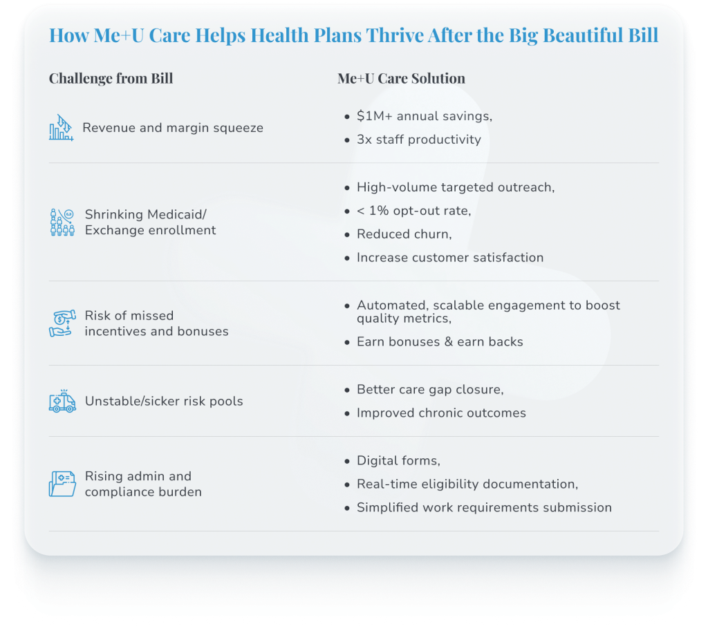 The health plans best positioned to weather the effects of the Big Beautiful Bill are those willing to rethink the infrastructure behind outreach, action, and outcomes. Me+U Care offers a foundation for scalable change, one that aligns operational priorities with member needs and can be implemented in under 30 days without IT integration.